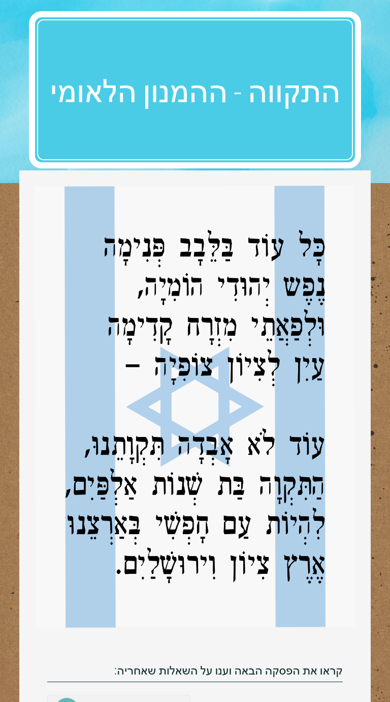 ×"×× ×× ×"תק×××" ×צ×'ת from dynamic.wizer.me שכונת התקווה, shkhunat hatikva) is a working class neighbourhood in southeastern tel aviv, israel. התקווה (הַתִּקְוָה) היא המנון מדינת ישראל המבוסס על השיר תקוותנו מאת נפתלי הרץ אימבר. הנוסח המובא כאן אינו הנוסח המלא, אותו שרים בחול. Lt → иврит → noa kirel & omer adam → התקווה. גרסת עומר אדם ונועה קירל להתקווה. כל עוד בלבב פנימה נפש יהודי הומייה, ולפאֲתי מזרח קדימה עין לציון צופייה; הרשתות החברתיות גועשות בעקבות הגרסה המחודשת של נועה קירל ועומר אדם להמנון הלאומי. וליצור חידוש פופי לשיר התקווה ולהתאים אותו למצב ההסברה לאחר מבצע שומר החומות.