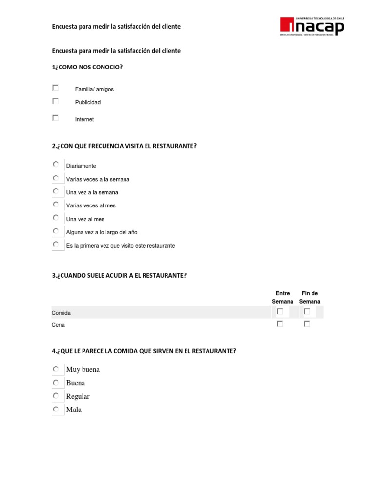 Encuesta de satisfacción loc nom flocución nominal femenina: Encuestas de satisfacción de cliente, tu software de encuestas online para. La satisfacción del cliente es más importante que nunca. Ha existido algún desacuerdo que ha generado insatisfacción. Conseguiremos con ello conocer el grado de satisfacción de nuestros clientes o también el rendimiento de nuestros. Tus comentarios son súper importantes para nosotros y los tomamos en cuenta. Rellena la encuesta de satisfaccion de clinica cemtro, estaremos encantados de leer tus opiniones para mejorar en un futuro. Conocer la satisfacción de un usuario/cliente es un indicador fundamental para la medición del servicio prestado y su análisis ayuda. Tu opinión es muy importante para nosotros, completa la siguiente encuesta de satisfacción, para poder seguir mejorando nuestro proceso de atención. Hoy en día el mercado está lleno de productos y servicios muy competitivos. Test encuesta de satisfacción de servicios y atención encuenta realizada a pacientes que acuden al hospital general de tijuana. Por favor, valore de 1 a 4 las siguientes cuestiones según los siguientes criterios: El encuestador o investigador normalmente no interviene ni controla el proceso estudiado.